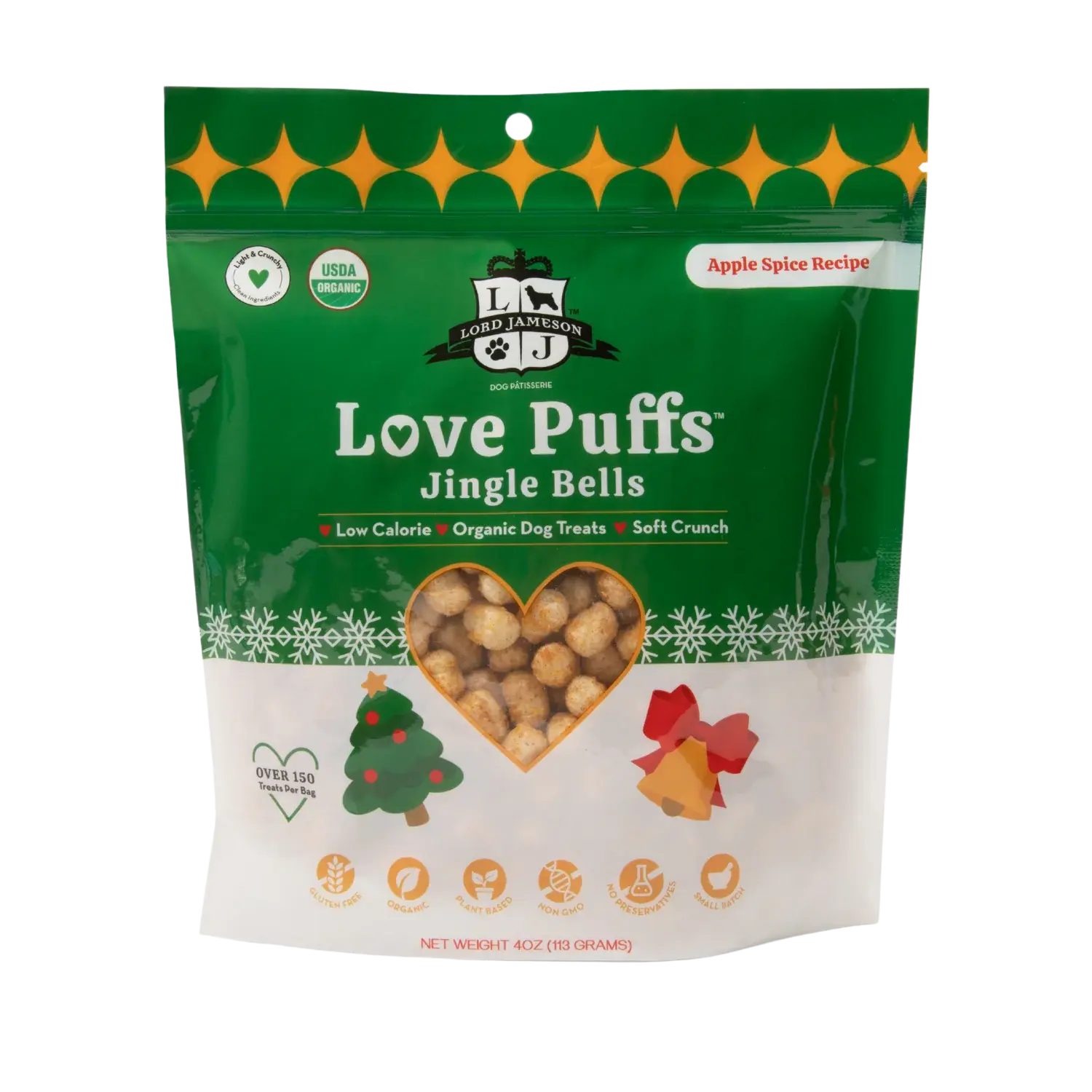 Bring the jingle to every tail wag this holiday season! Jingle Bells feature a festive blend of organic apple with a touch of cinnamon to create a light, crunchy puff kissed with holiday cheer. Naturally wholesome and made without artificial dyes, this seasonal snack is one dogs can’t resist. With fewer than 2 calories per puff, Love Puffs are a low-calorie, easily digestible treat that fits most dietary needs or restrictions and are perfect for dogs of all breeds and life stages.