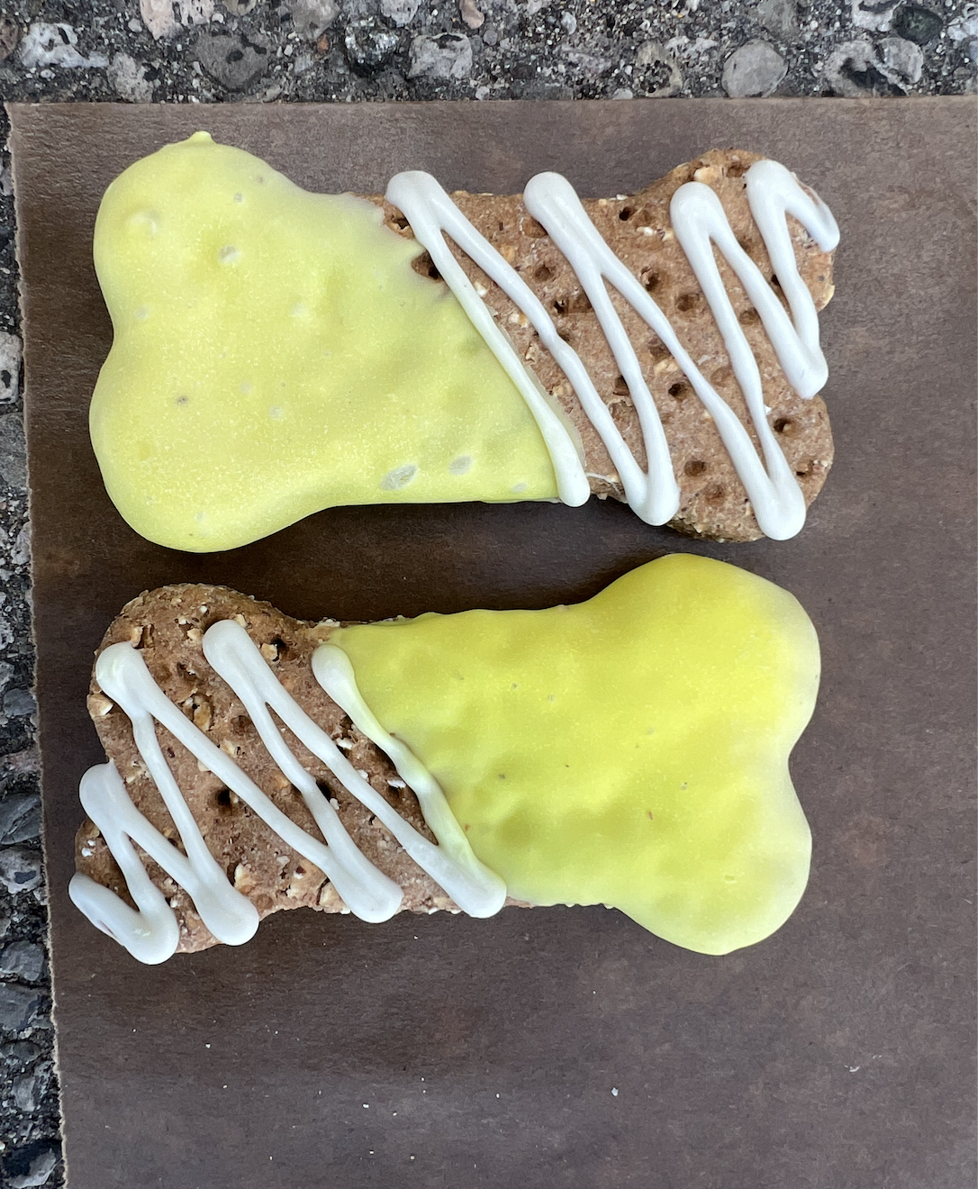 Ingredients: Organic spelt flour, barley flour, barley flakes, all natural peanut butter, pure bananas, flax seeds, ground flax, yogurt chips and turmeric.