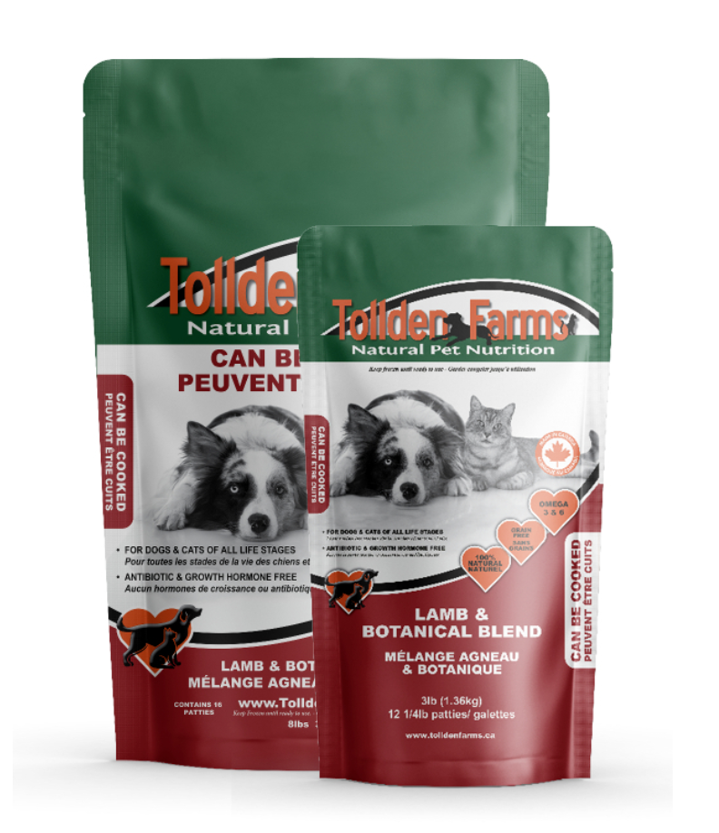 Double ground lamb, heart, liver; botanical blend of seeds, roots and grasses consisting of: dandelion leaves, lemon grass, parsley, burdock root, oat straw, kelp, Omega 3 old water, cold pressed fish oil (18 DHA, 12 EPA), calcium carbonate
